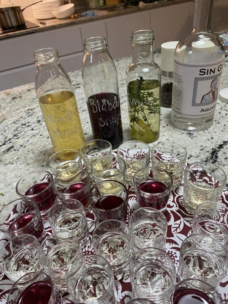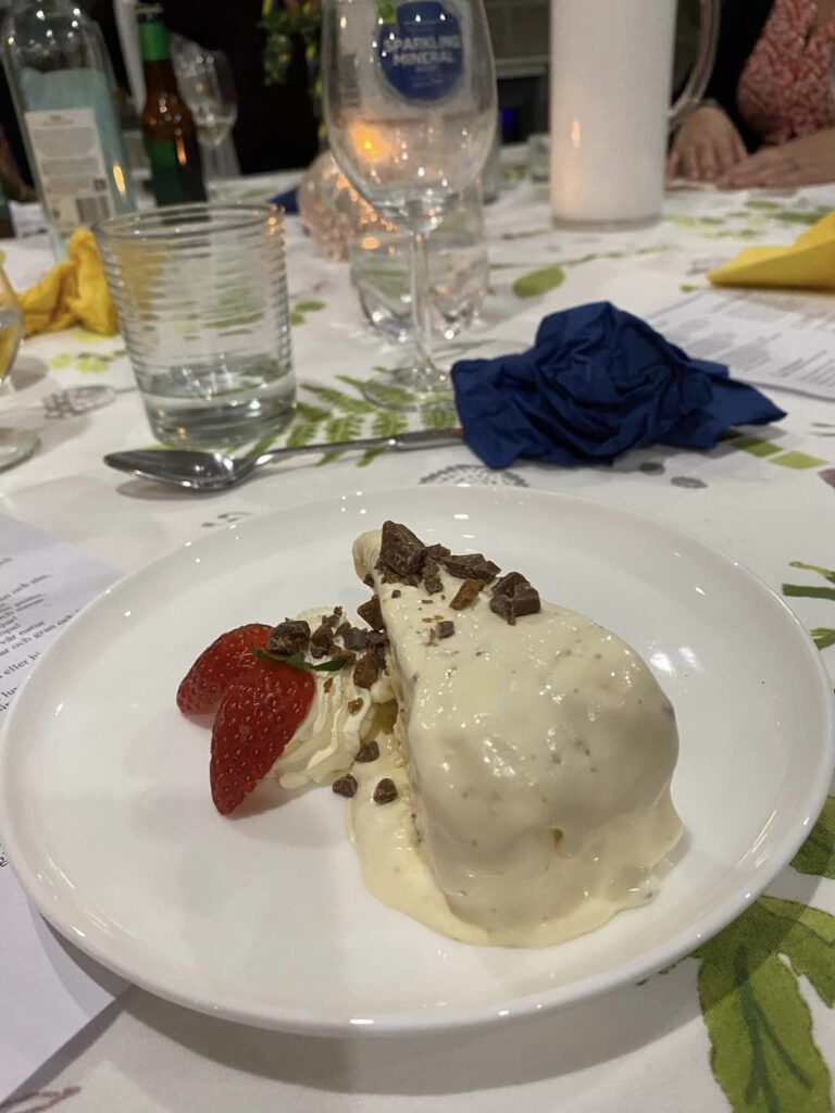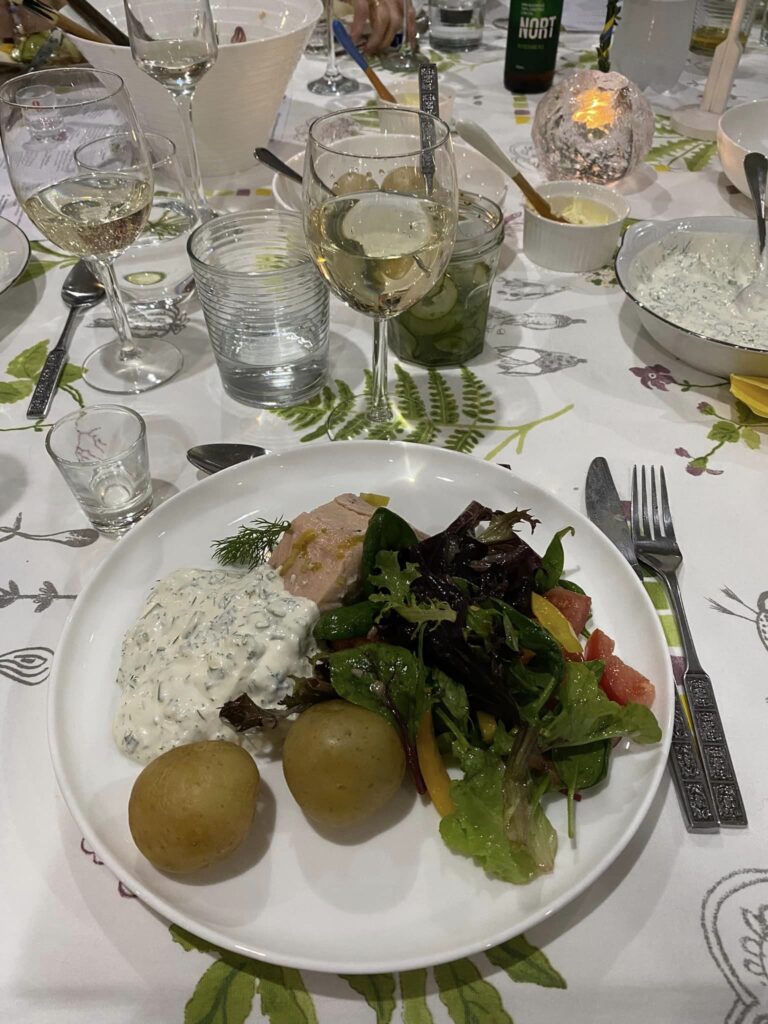 Snapas (tallrik med sill och annat gott) + hemgjord snaps, inkokt lax med örtagårdssås, potatis och sallad,  punschparfait med dajm.